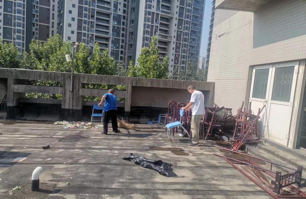 学生餐厅楼顶淤泥杂物清理现场