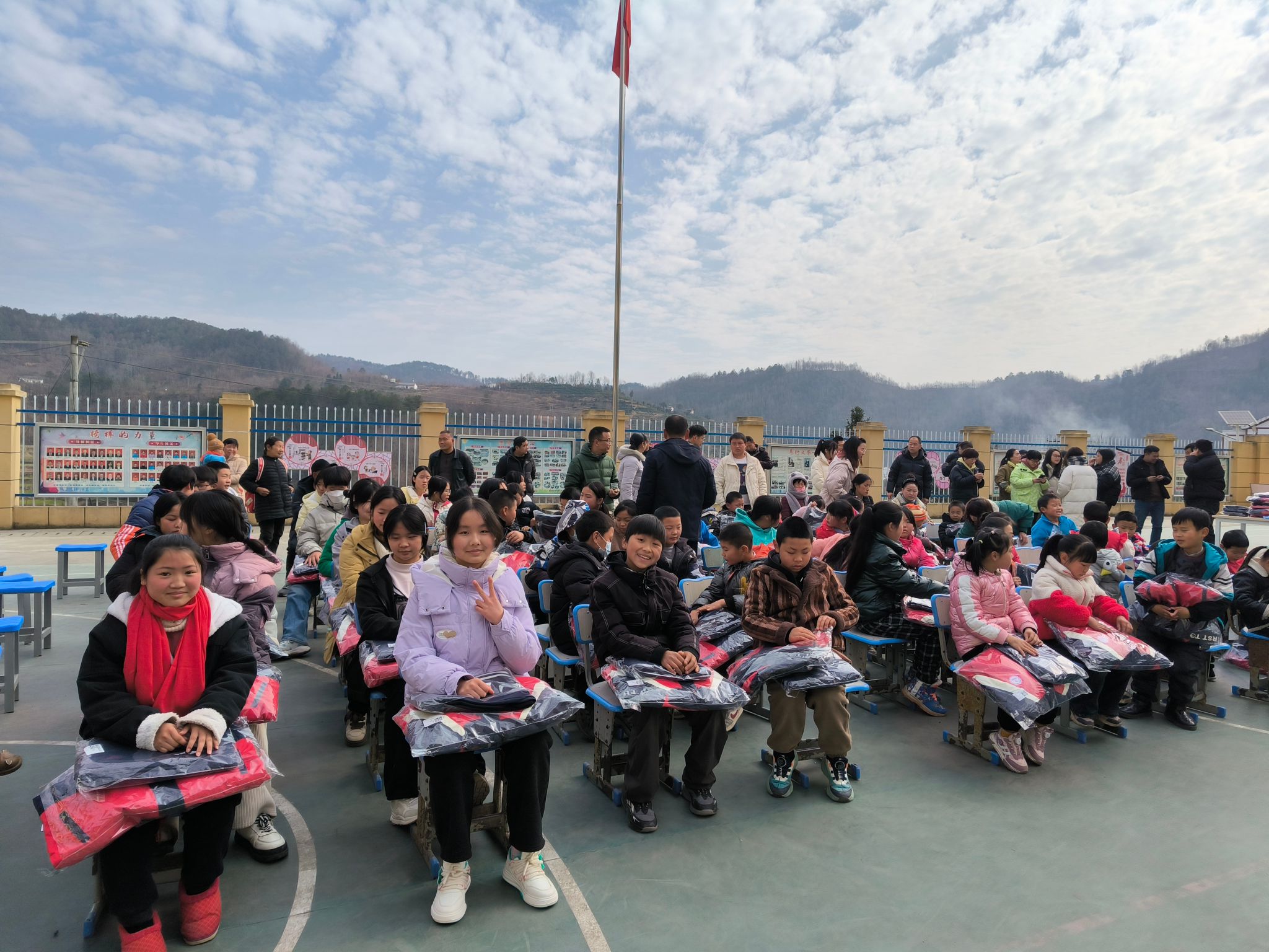 本网讯 为了让孩子们温暖过冬,安心学习,1月17日,我校乡村振兴驻村工作队携手中国社会福利基金会暖流计划公益基金东航驿站,在县河镇财梁九年制学校举行了冬装校服套装捐赠仪式。县河镇副镇长杨涛、组织委员王亚琪,我校乡村振兴驻村工作队、中国福利基金会工作人员及学校全体师生参加。